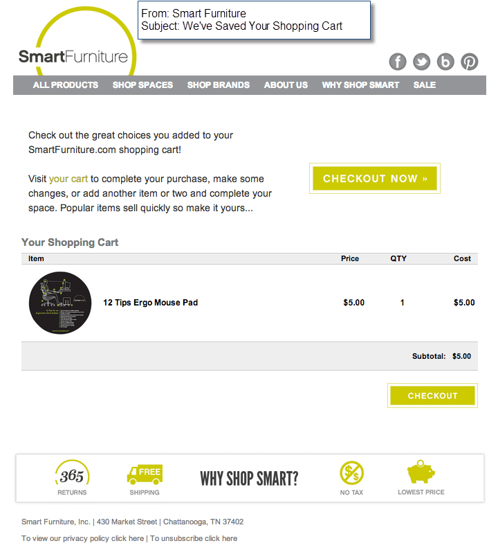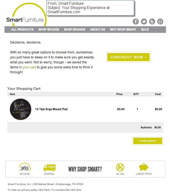 Email #1: Thúc đẩy khách hàng “Checkout Now” và nói thêm “Vào xem lại giỏ hàng của bạn để hoàn thành việc mua sắm, thay đổi đơn hàng hoặc thêm một, hai thứ đồ dùng cho không gian nhà bạn. Những mặt hàng phổ biến thường bán chạy. Bởi vậy, hãy mua ngay”.